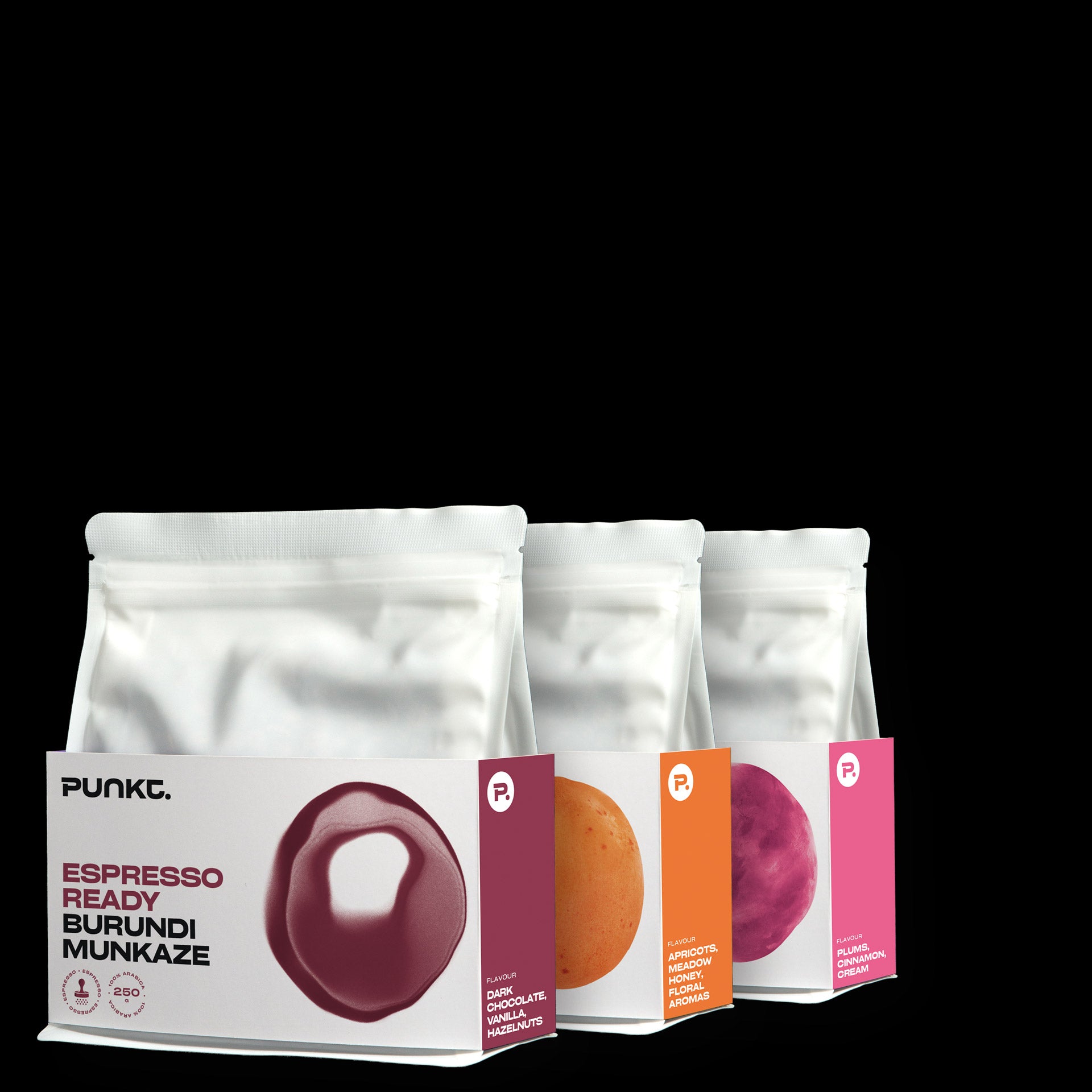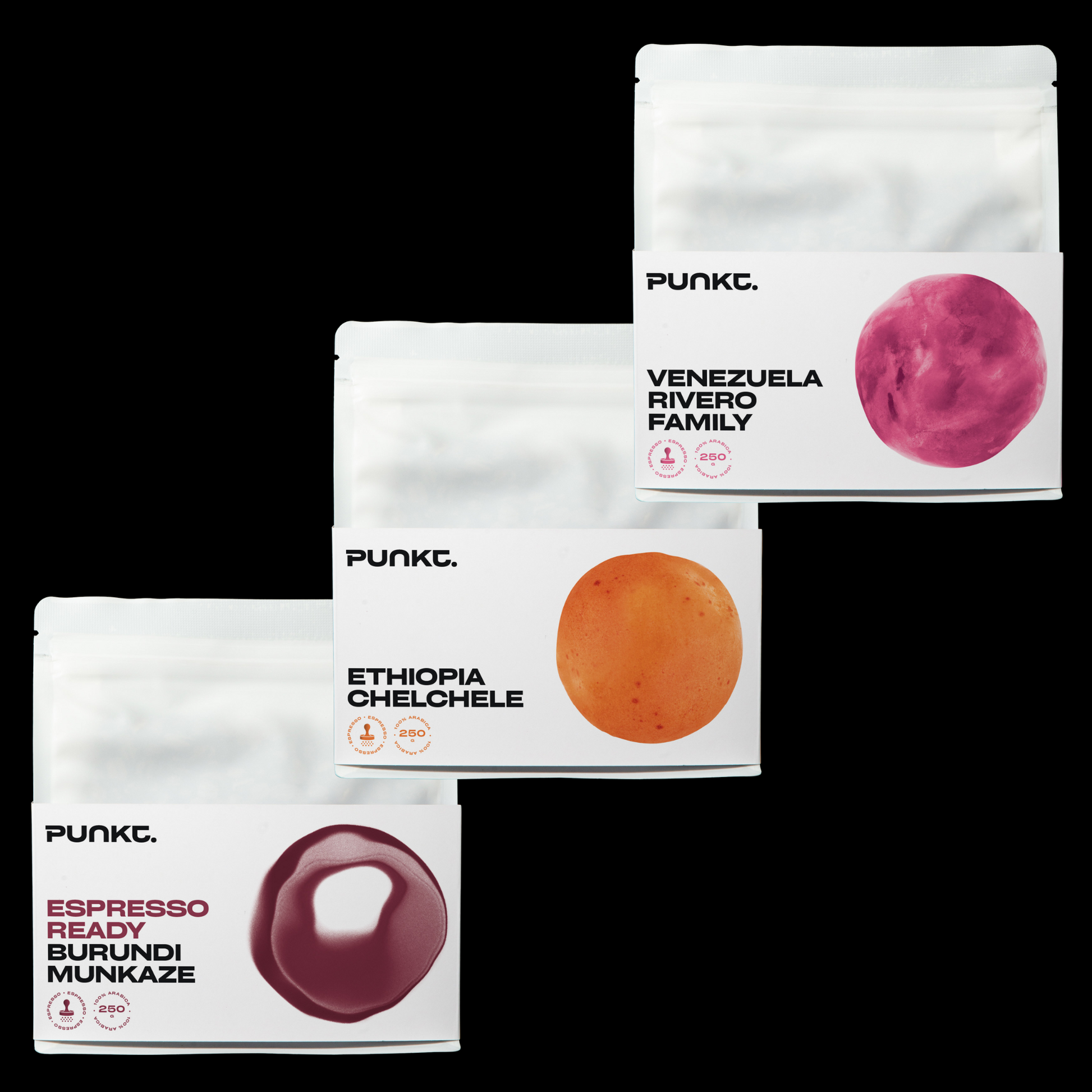 Výhodný balíček tří espresových káv nabízí pestrý průřez chutěmi. Konzervativní čokoládové Burundi Munkaze doplňuje kořeněná Venezuela Rivero Family s tóny skořice a svěží Etiopie Chelchele s ovocným charakterem zralých meruněk. Ideální volba pro objevování různých stylů espressa.